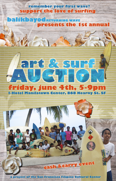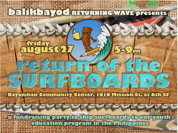 Balikbayod Returning Wave presents: Return of the Surfboards Friday August 27, 5-9pm Bayanihan Community Center, 1010 Mission St. at 6th, San Francisco …A fundraising party to ship donated surfboards to our youth education program in the Philippines Join us for an ART SALE with live music, food, dance & cash bar. Sounds by DJ LapuLapu … Continue reading You’re Invited! ART SALE Fundraising Party – August 27th, 5-9PM